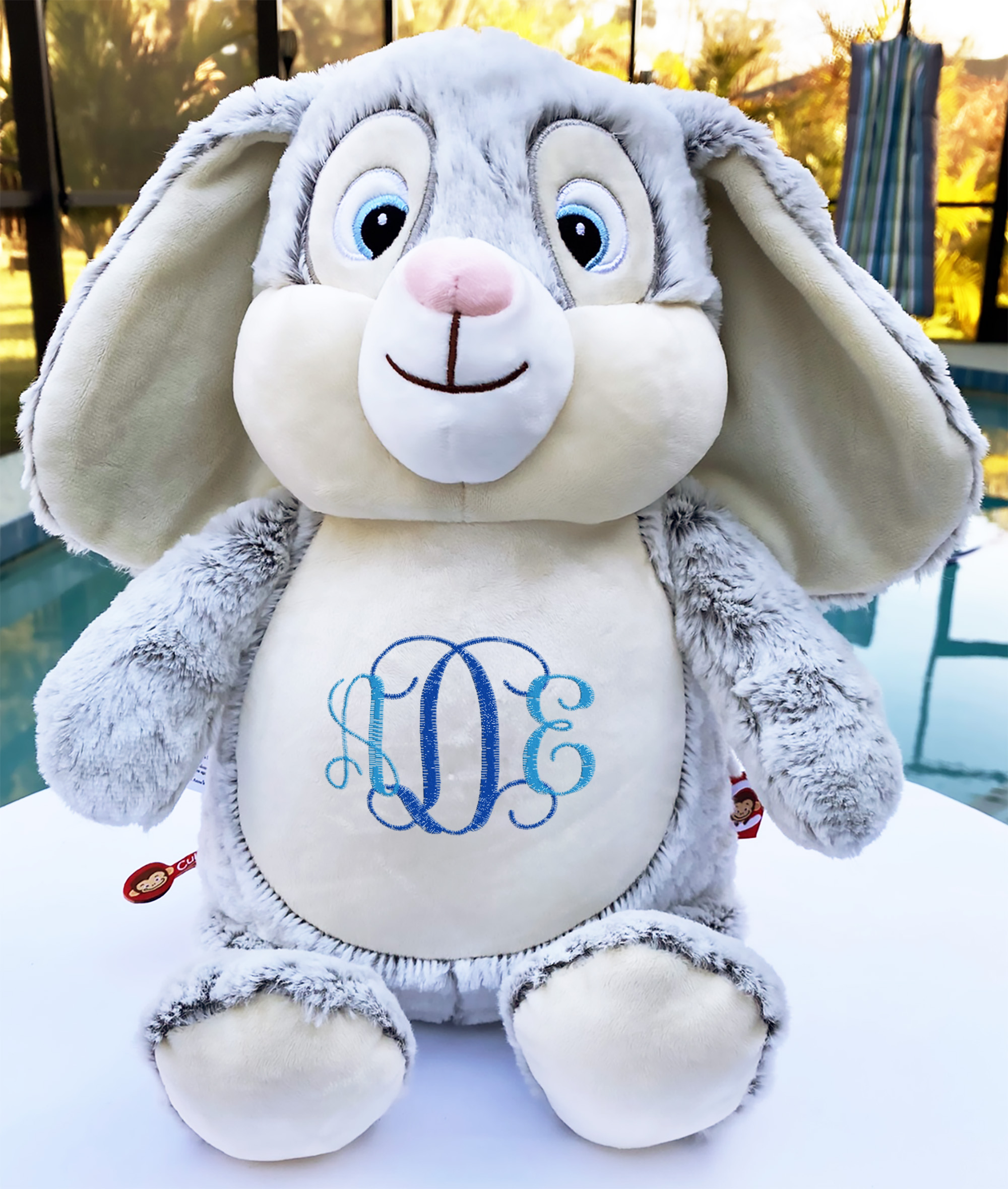 This adorable bunny is 17" from the top of the head to the bottom of its little feet, and can be customized to fit your special occasion. When sitting, the bunny is about 14" tall, and sooo soft and smooshy and huggable!!