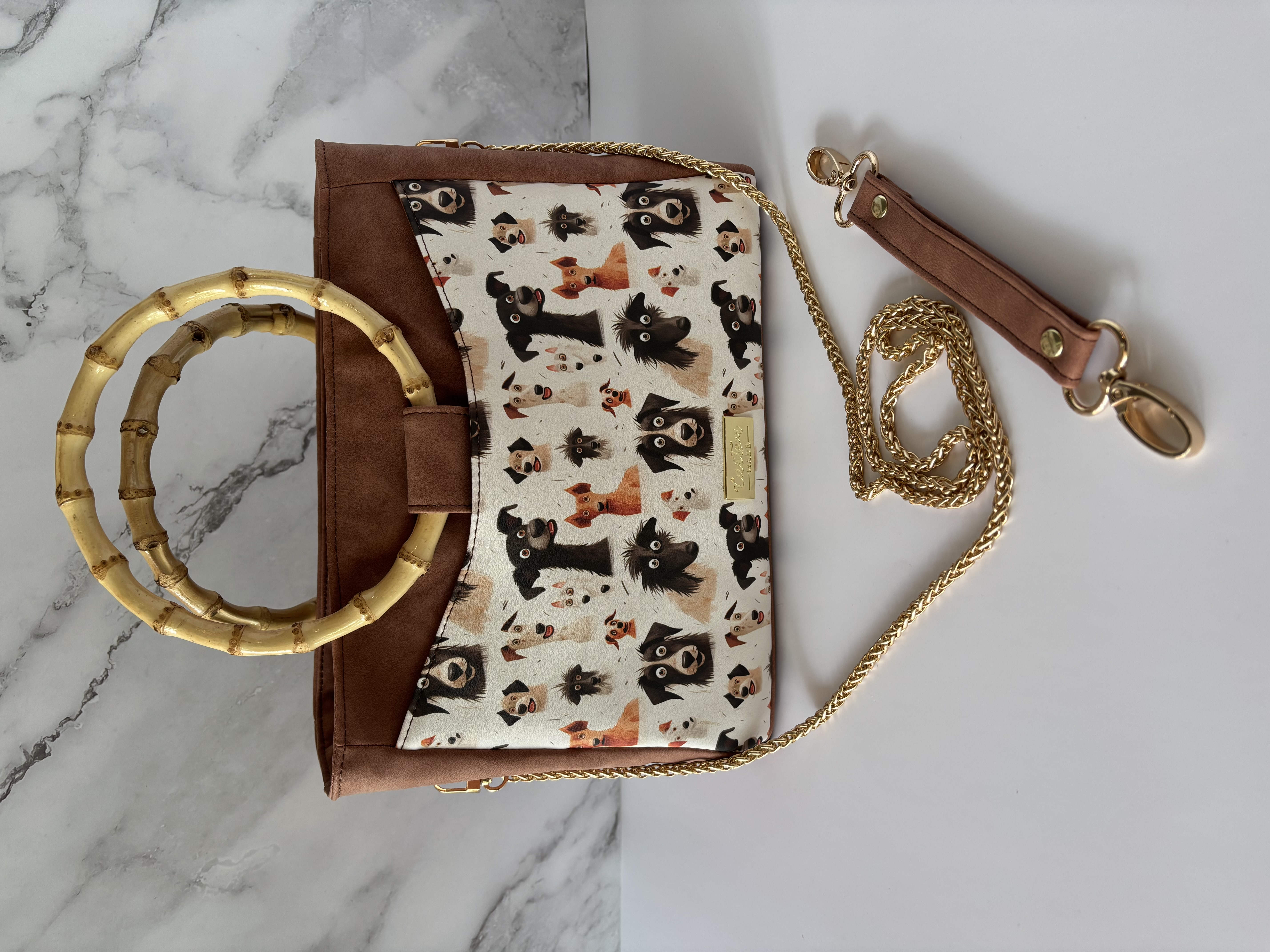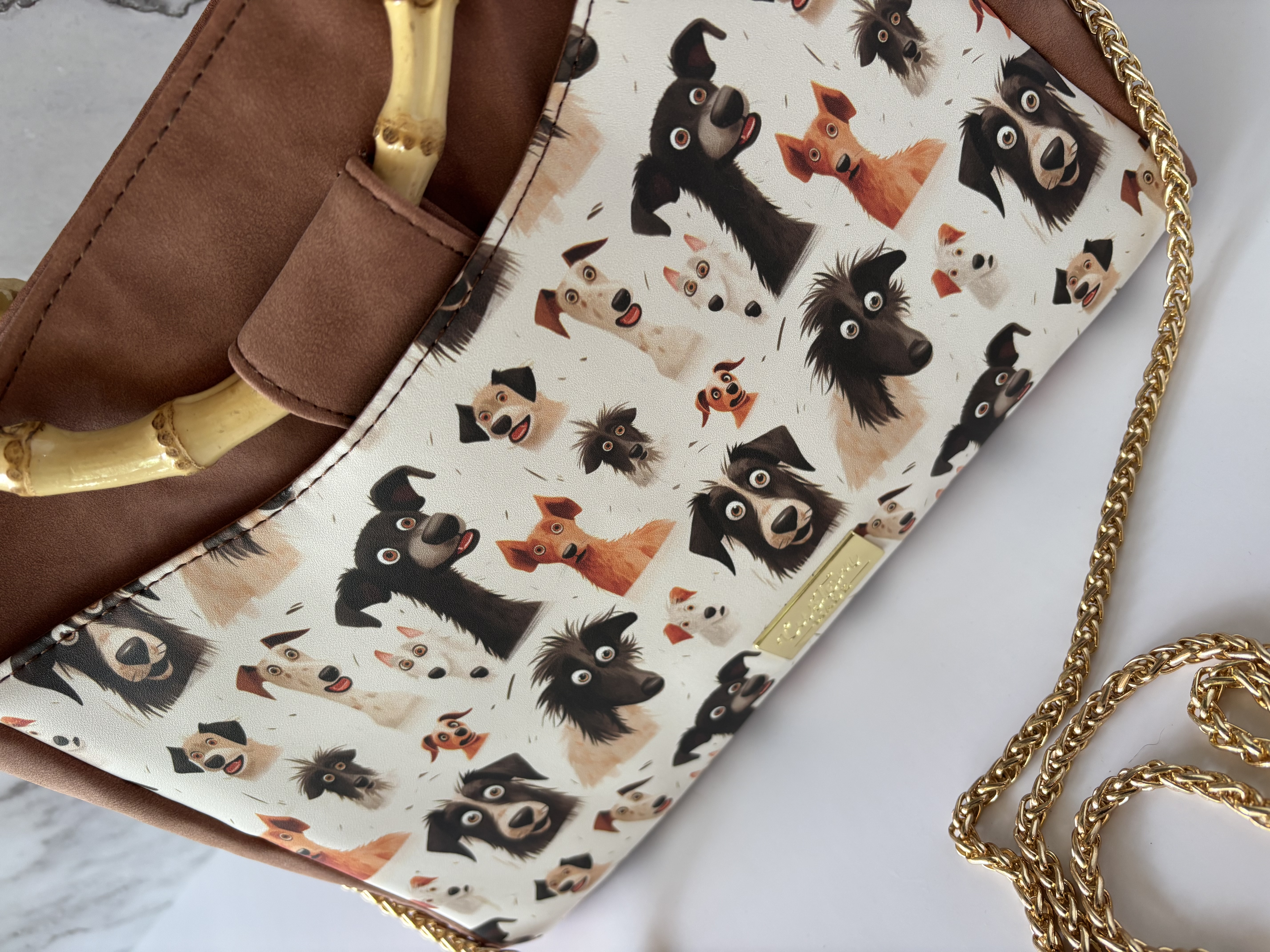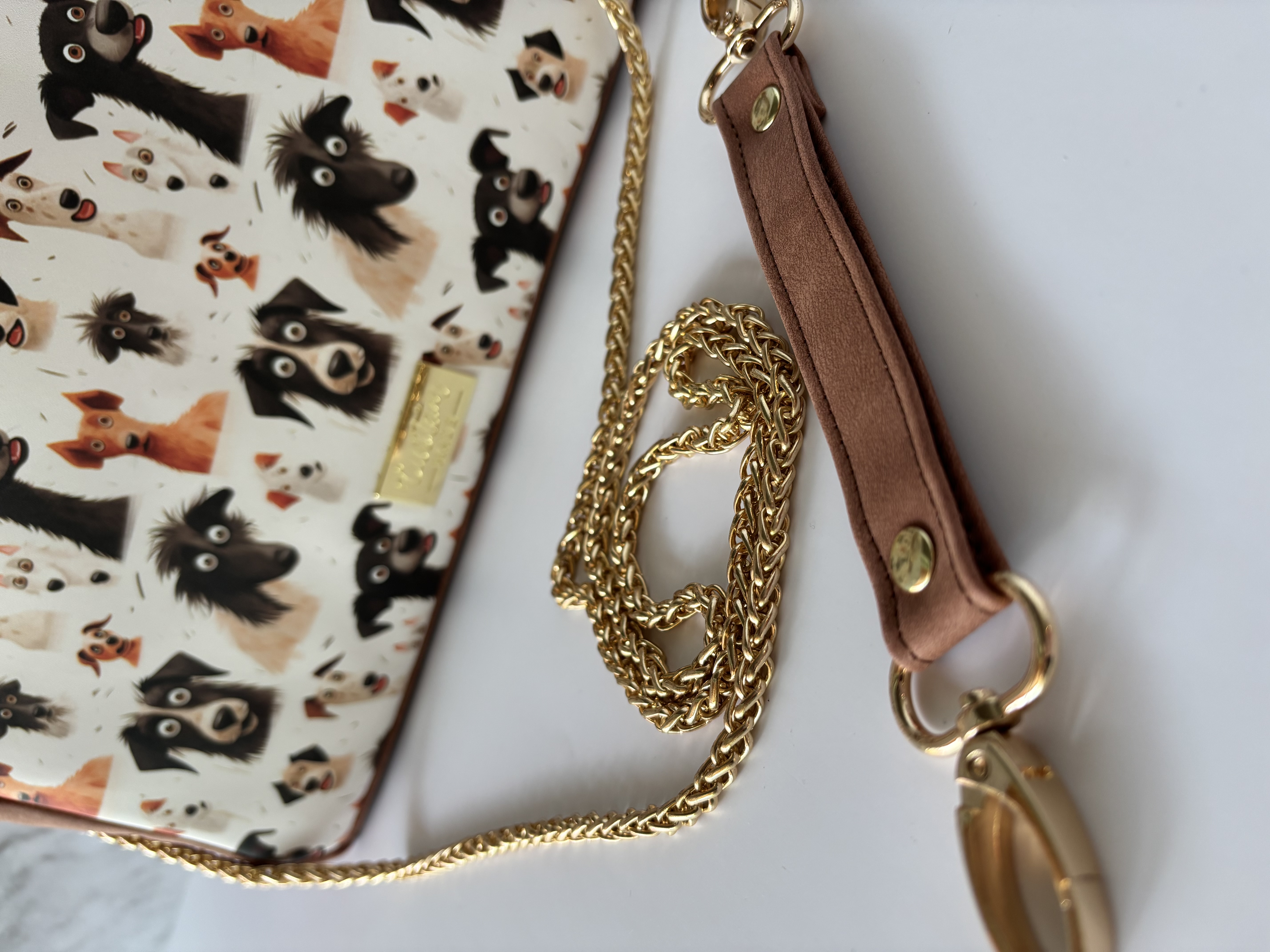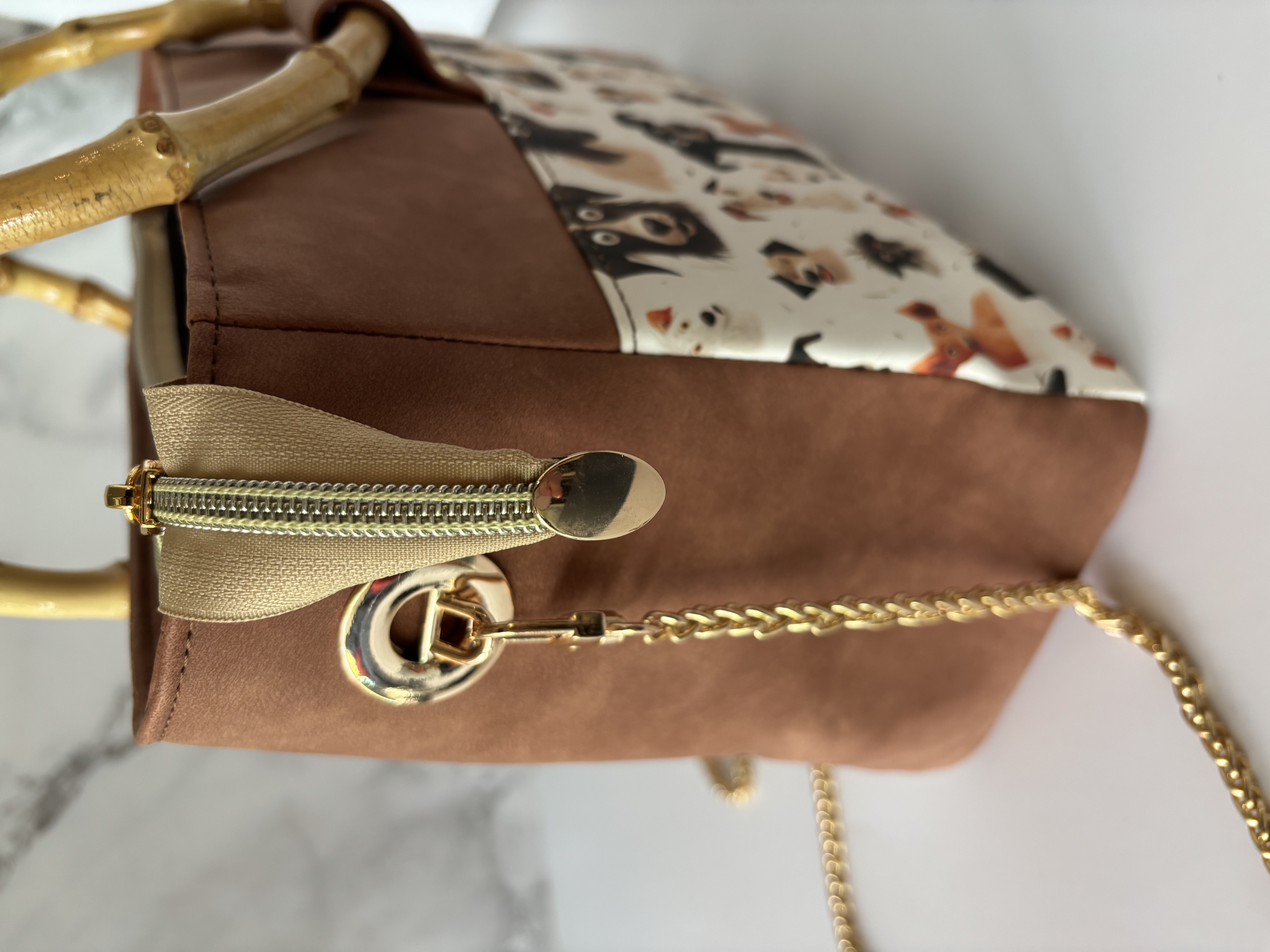 This handbag is the most adorable bag for the dog lover you’ve ever seen! This custom, medium size handbag is eye catching, and it is one people will ask about because it is so unique. The tanned colored faux leather is buttery soft and the textured print on the front and back is beyond adorable. On the front of the bag there is a slip pocket, large enough for your phone. It has a gorgeous chain strap that is long enough to be a cross-body, and it is a fine chain material that doesn’t kink up. The bonus is a key chain to help keep your keys from getting lost inside the bag.