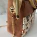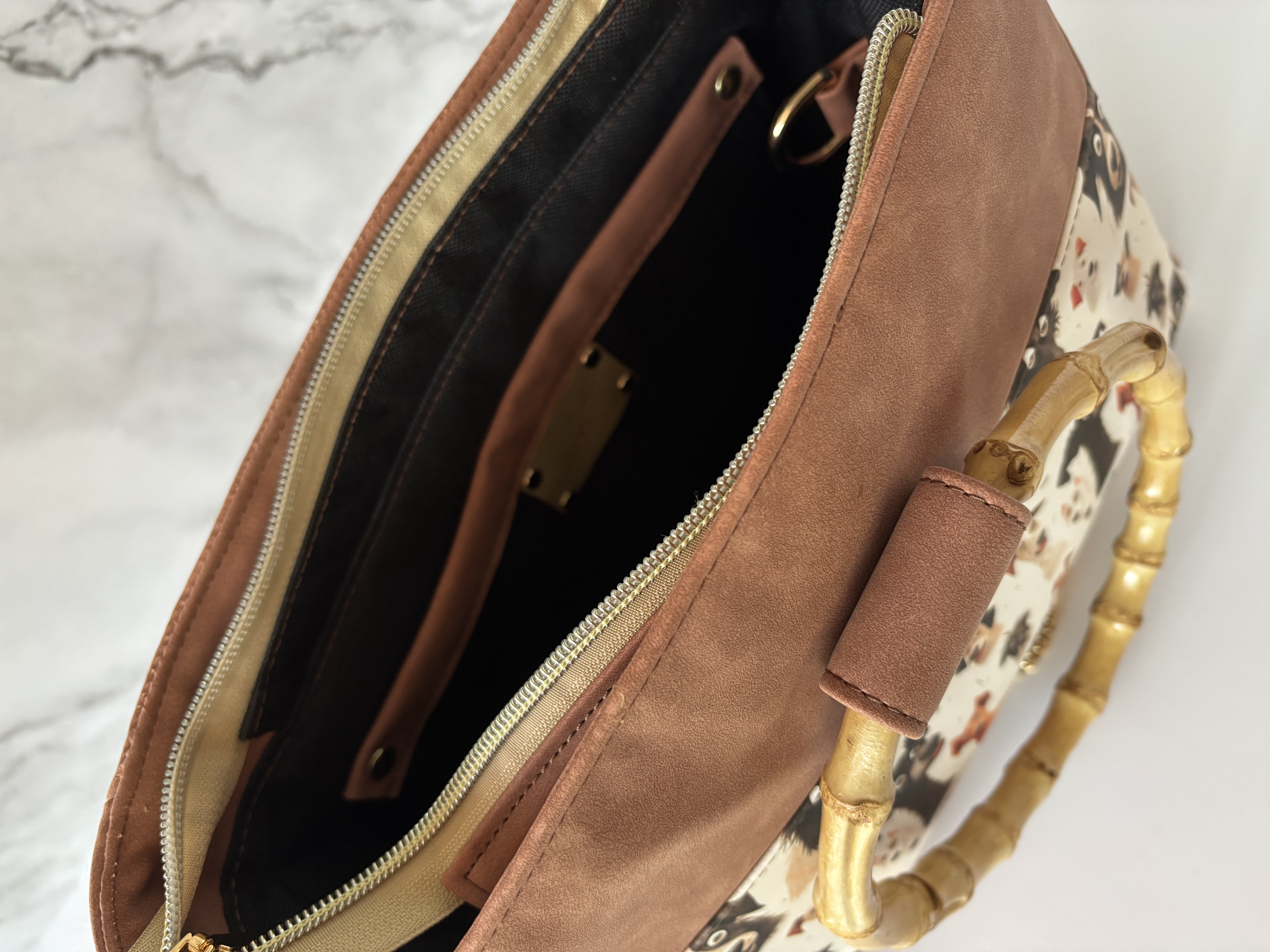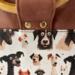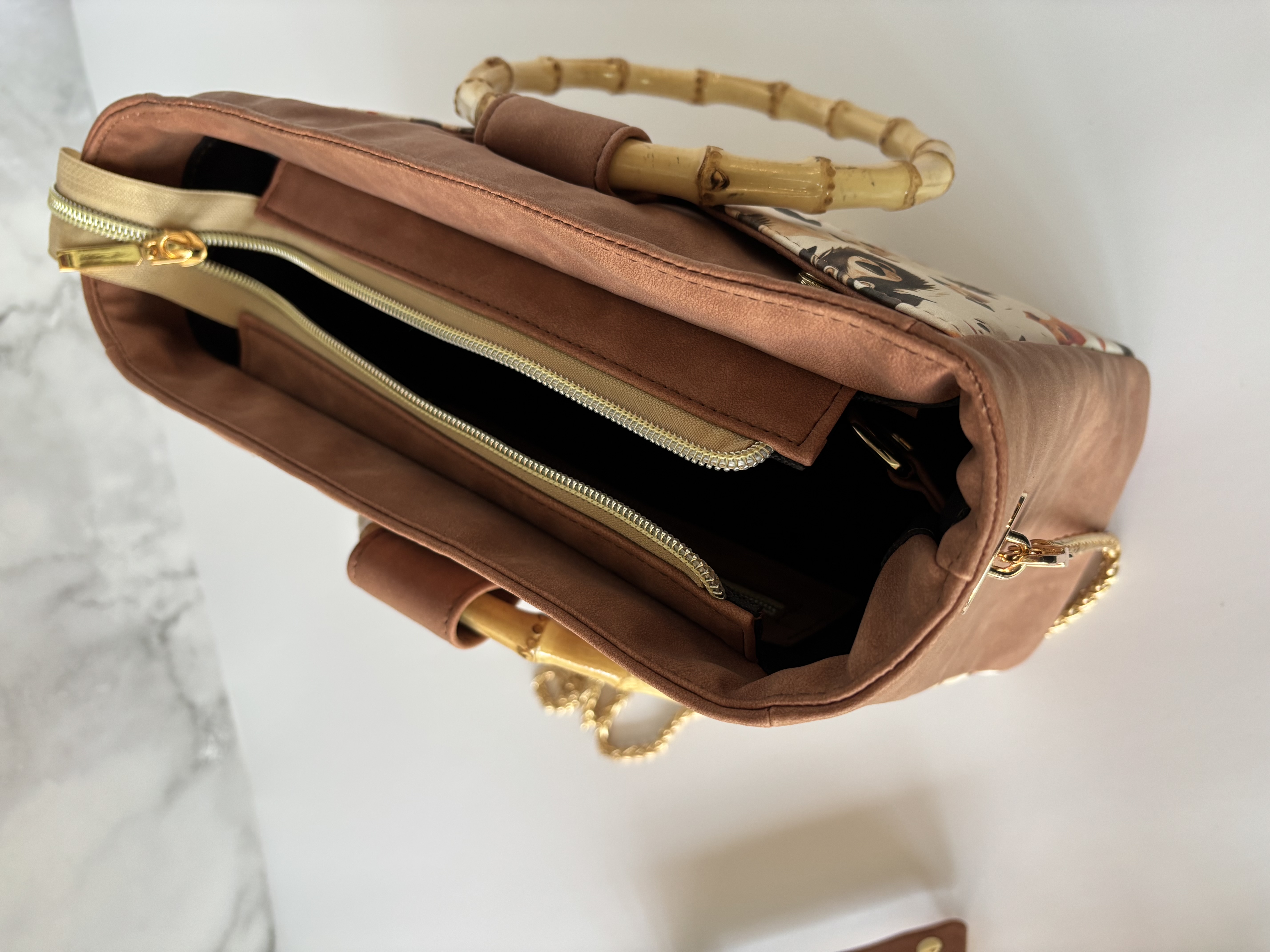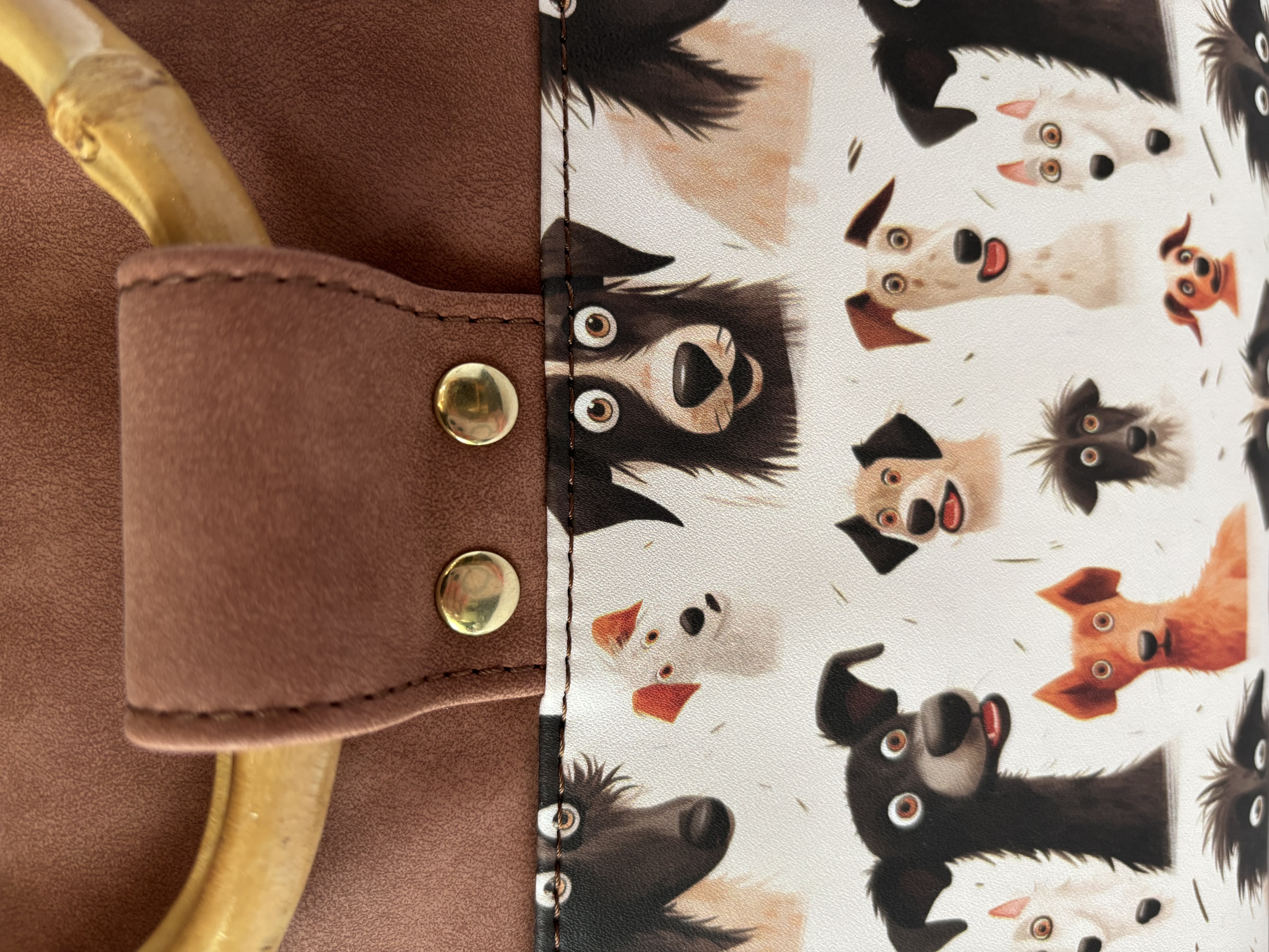 This handbag is the most adorable bag for the dog lover you’ve ever seen! This custom, medium size handbag is eye catching, and it is one people will ask about because it is so unique. The tanned colored faux leather is buttery soft and the textured print on the front and back is beyond adorable. On the front of the bag there is a slip pocket, large enough for your phone. It has a gorgeous chain strap that is long enough to be a cross-body, and it is a fine chain material that doesn’t kink up. The bonus is a key chain to help keep your keys from getting lost inside the bag.