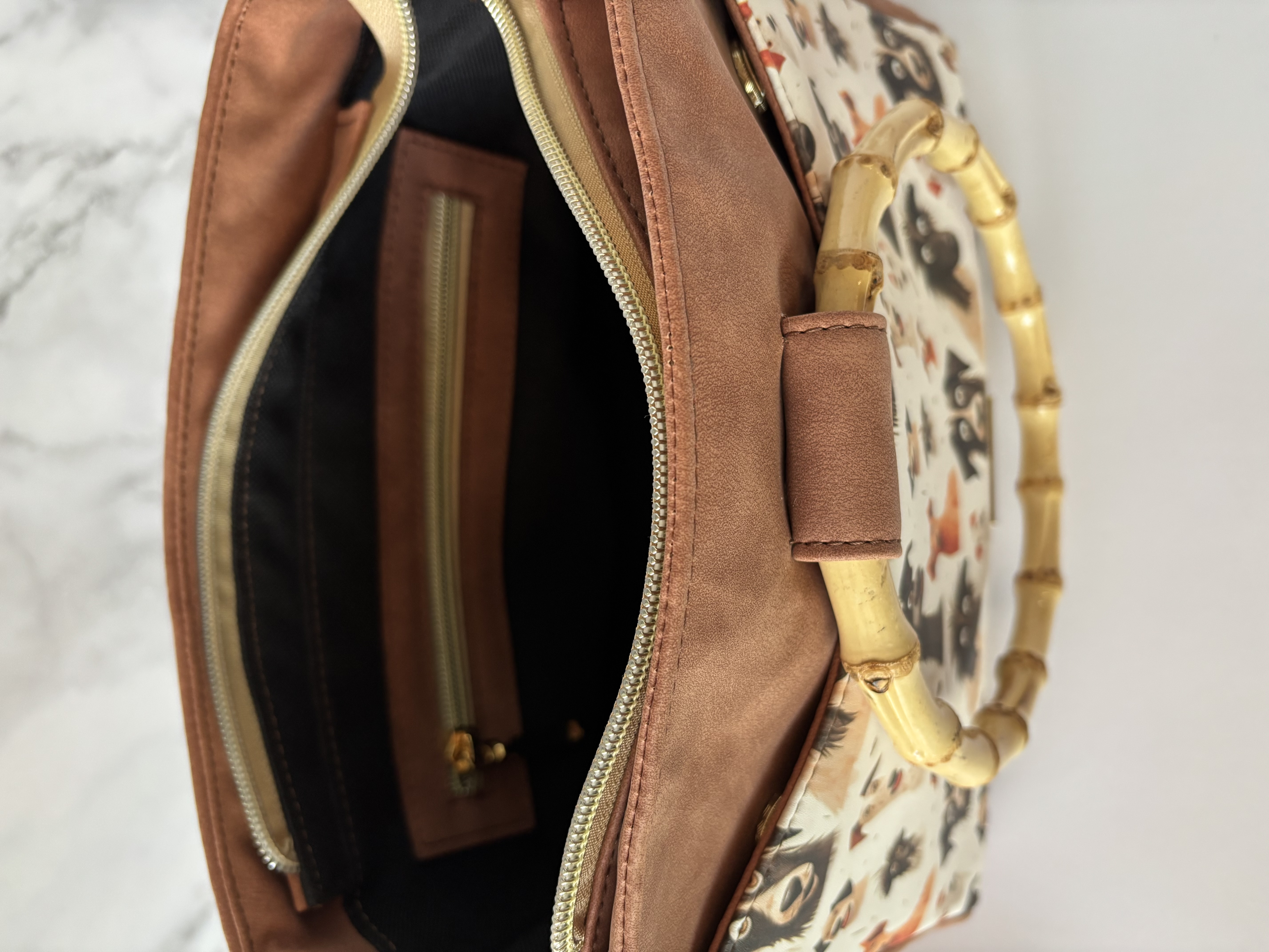 There is a large zippered pocket and a slip pocket on the interior, but you can have both or none . . . your choice! This funny, adorable handbag is stunning, but also functional! The outside pocket stays closed with 2 magnetic slim snaps. This medium size bag may not be huge, but it is very roomy … it measures 11" wide, 8.5" tall (excluding the handles), and is about 4.5" at the base.