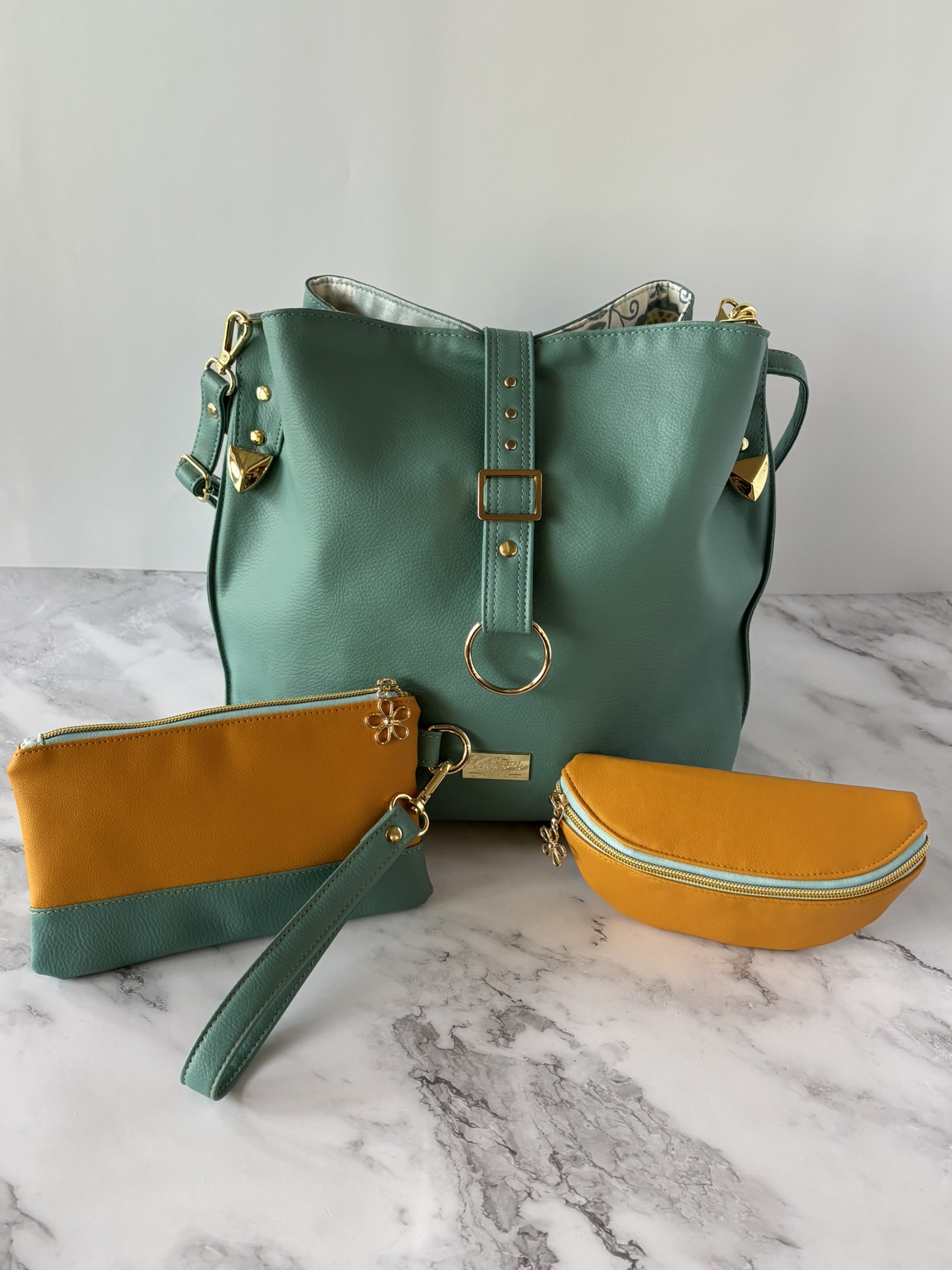 I honestly don't know anyone who wouldn't love this set. The pastel wintergreen semi-slouch handbag is the definition of effortless charm—soft, roomy, and it also is structured enough to stand on its own. It has that bucket/hobo slouchy bag feel, while keeping some structure due to the interior construction. Aside from being the perfect size, it can be carried as a handbag, shoulder bag or a cross-body. The interior is very unique -- with a very large, deep zippered pocket, with two large slip pockets on each side.