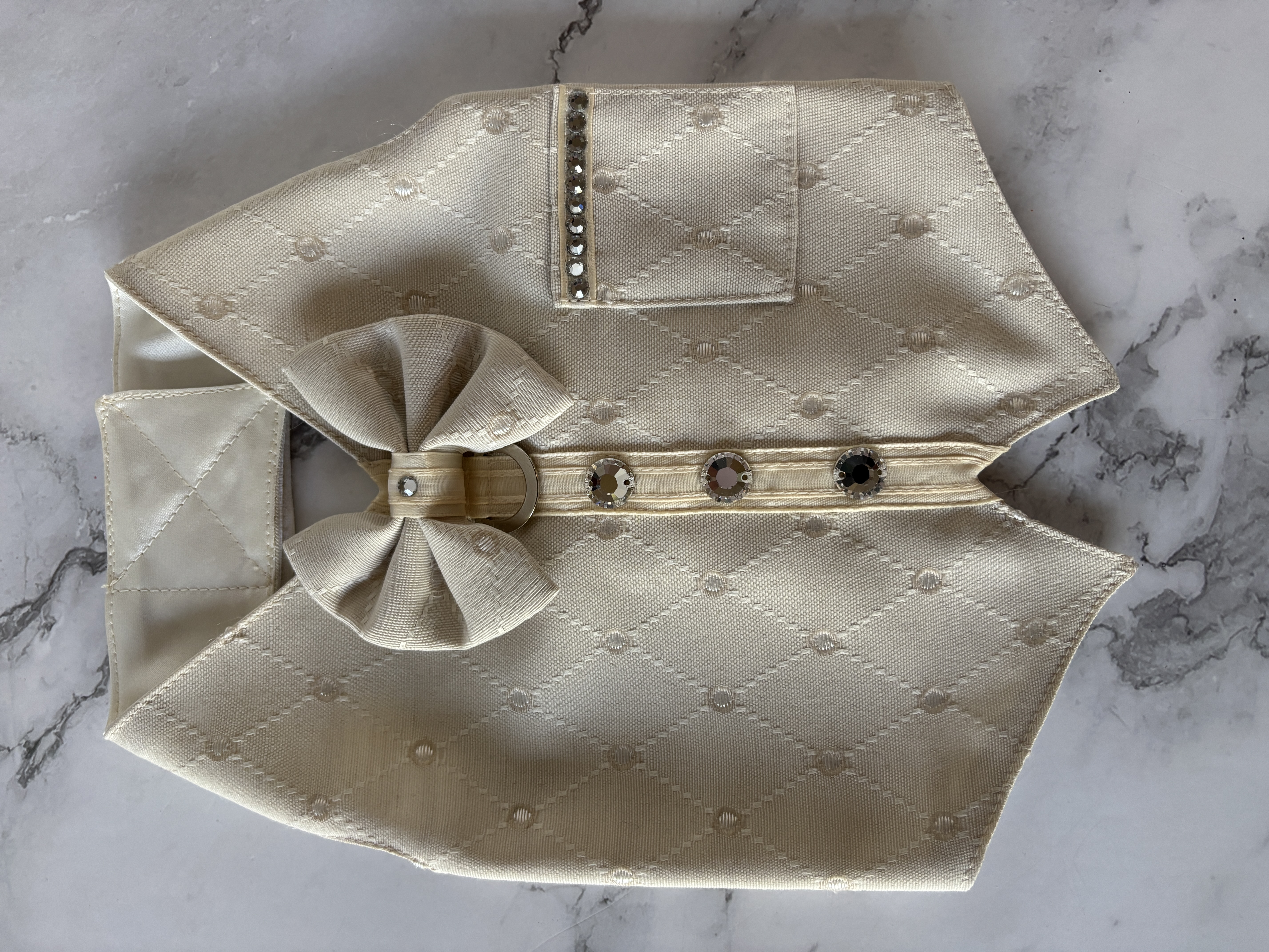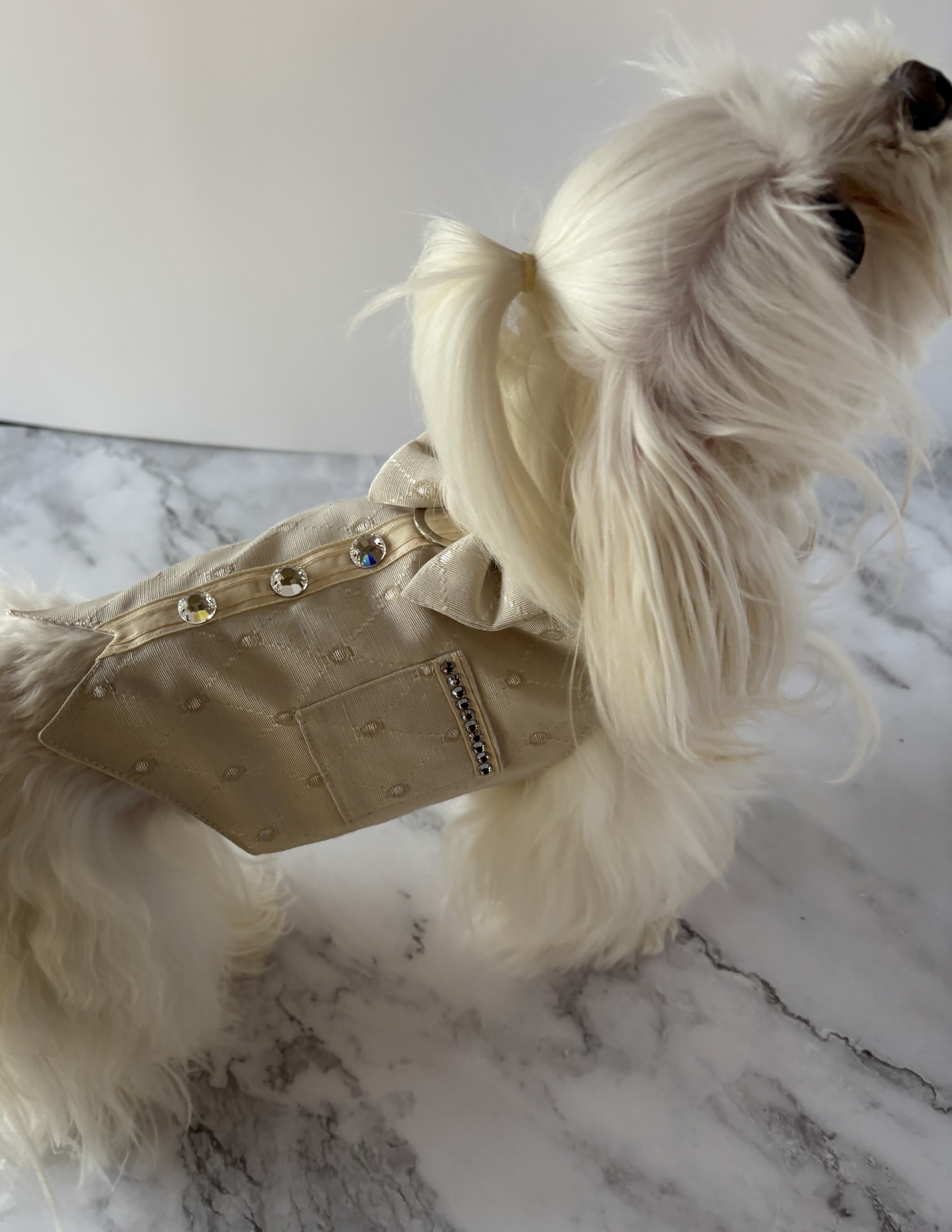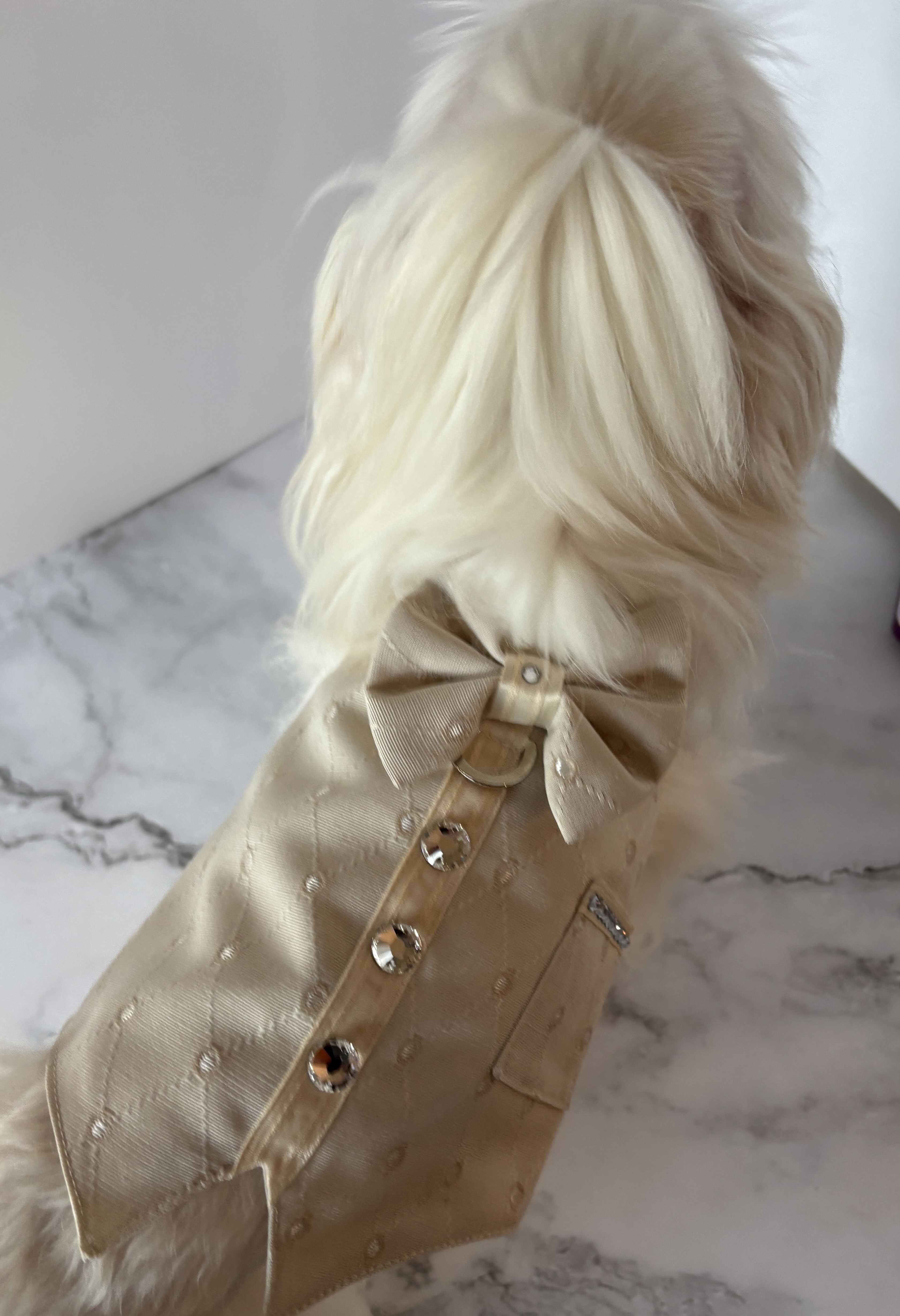 Truly, this is one of the most gorgeous vests I ever made. The fabric, the gorgeous Austrian crystals including over-sized crystals as buttons, and the usable pocket! It is stunning! The harness has a solid cast D-ring to use for a leash, and is made this using pure Austrian Crystals (I can no longer use the name brand of the crystals because I am no longer a brand partner with them), and they are stunning and capture the light so beautifully.