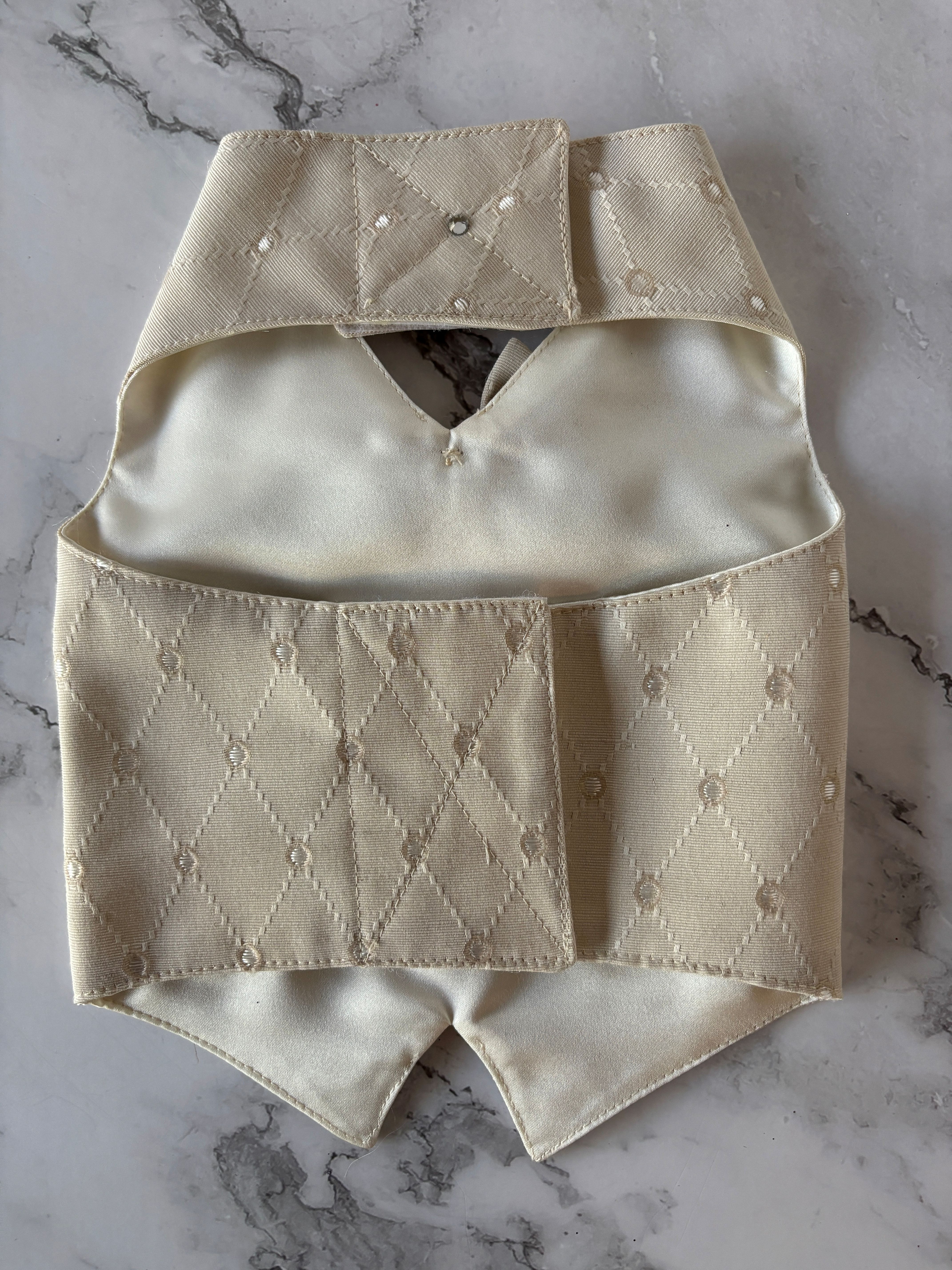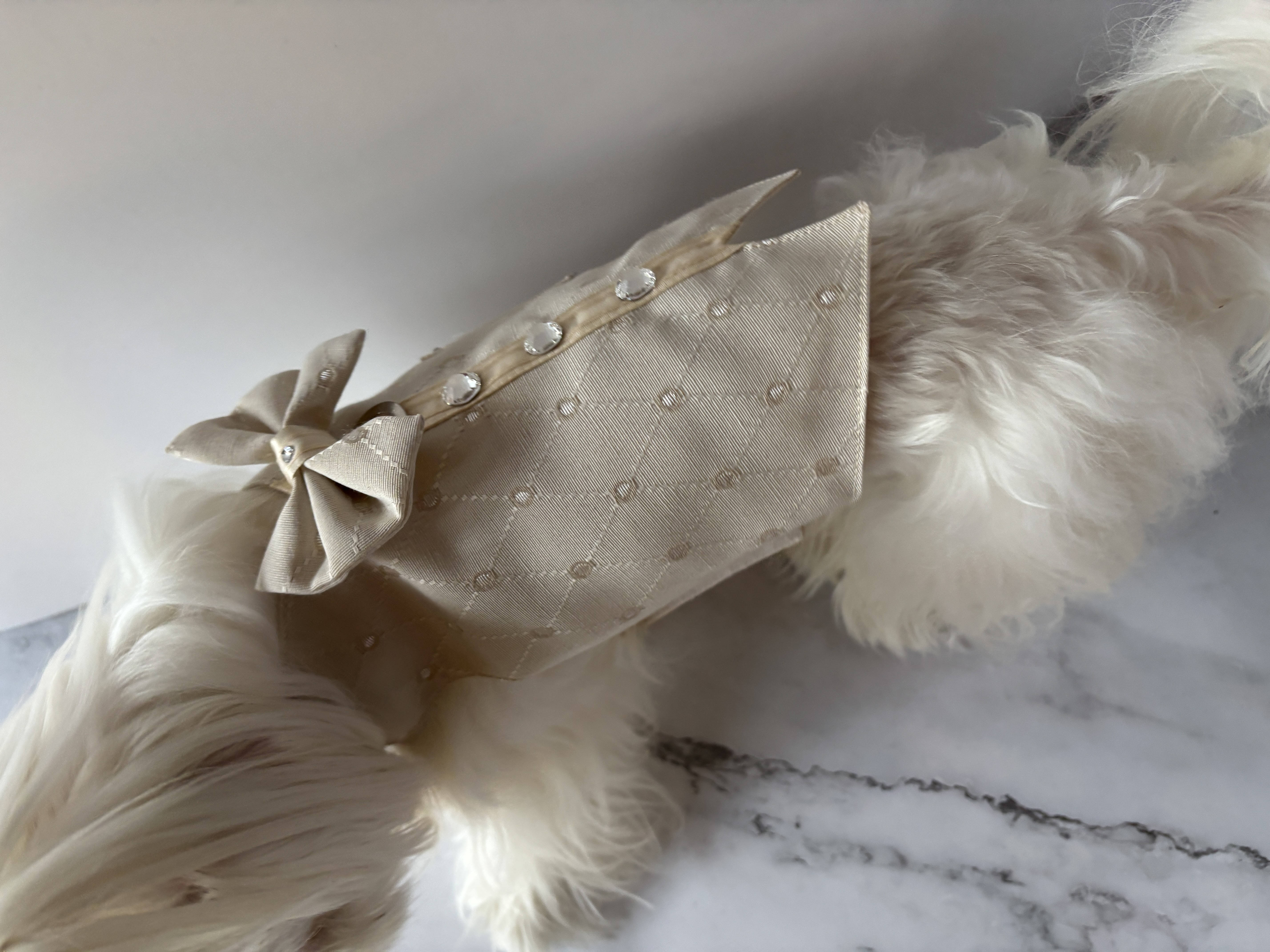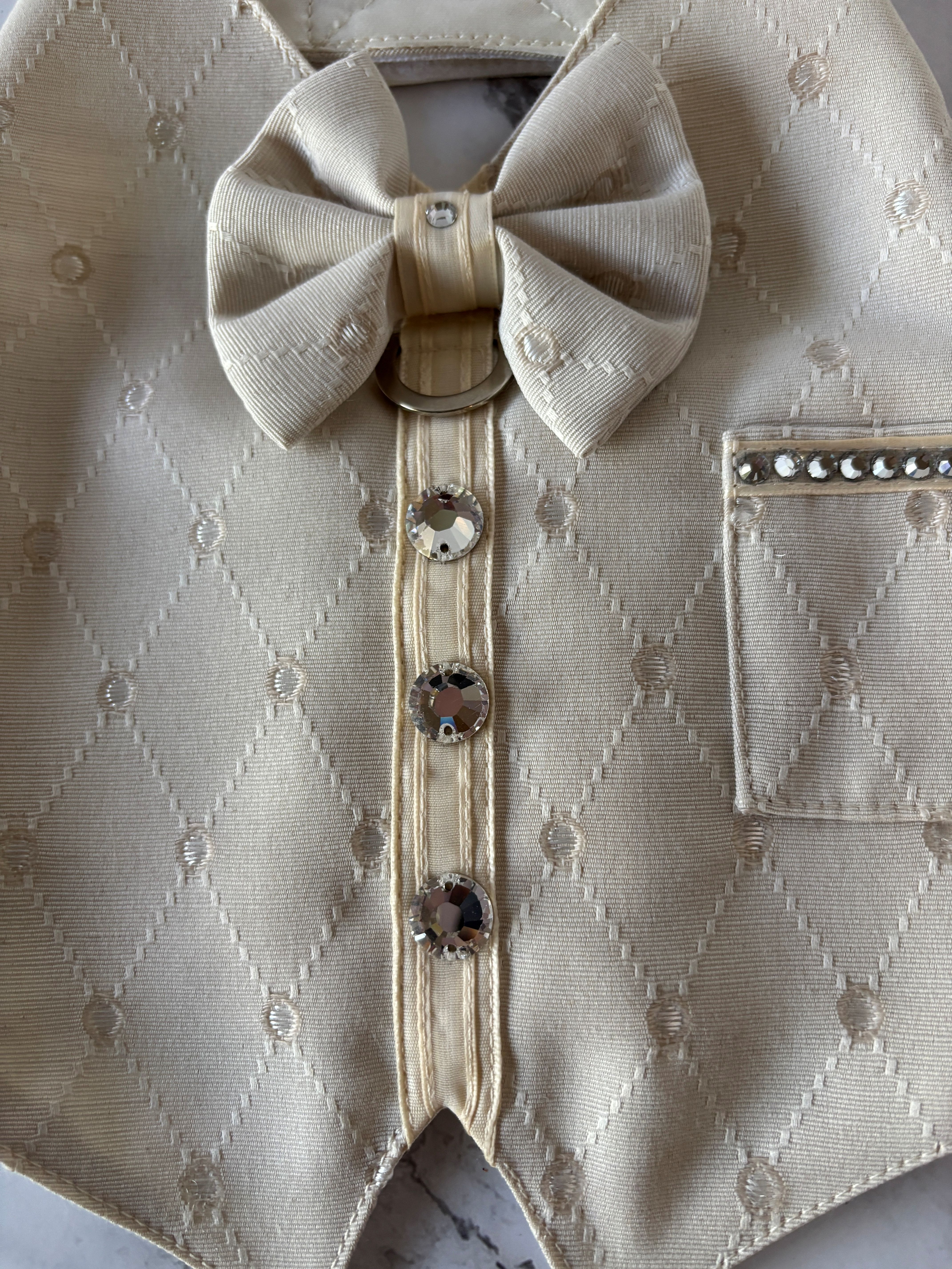 Truly, this is one of the most gorgeous vests I ever made. The fabric, the gorgeous Austrian crystals including over-sized crystals as buttons, and the usable pocket! It is stunning! The harness has a solid cast D-ring to use for a leash, and is made this using pure Austrian Crystals (I can no longer use the name brand of the crystals because I am no longer a brand partner with them), and they are stunning and capture the light so beautifully.