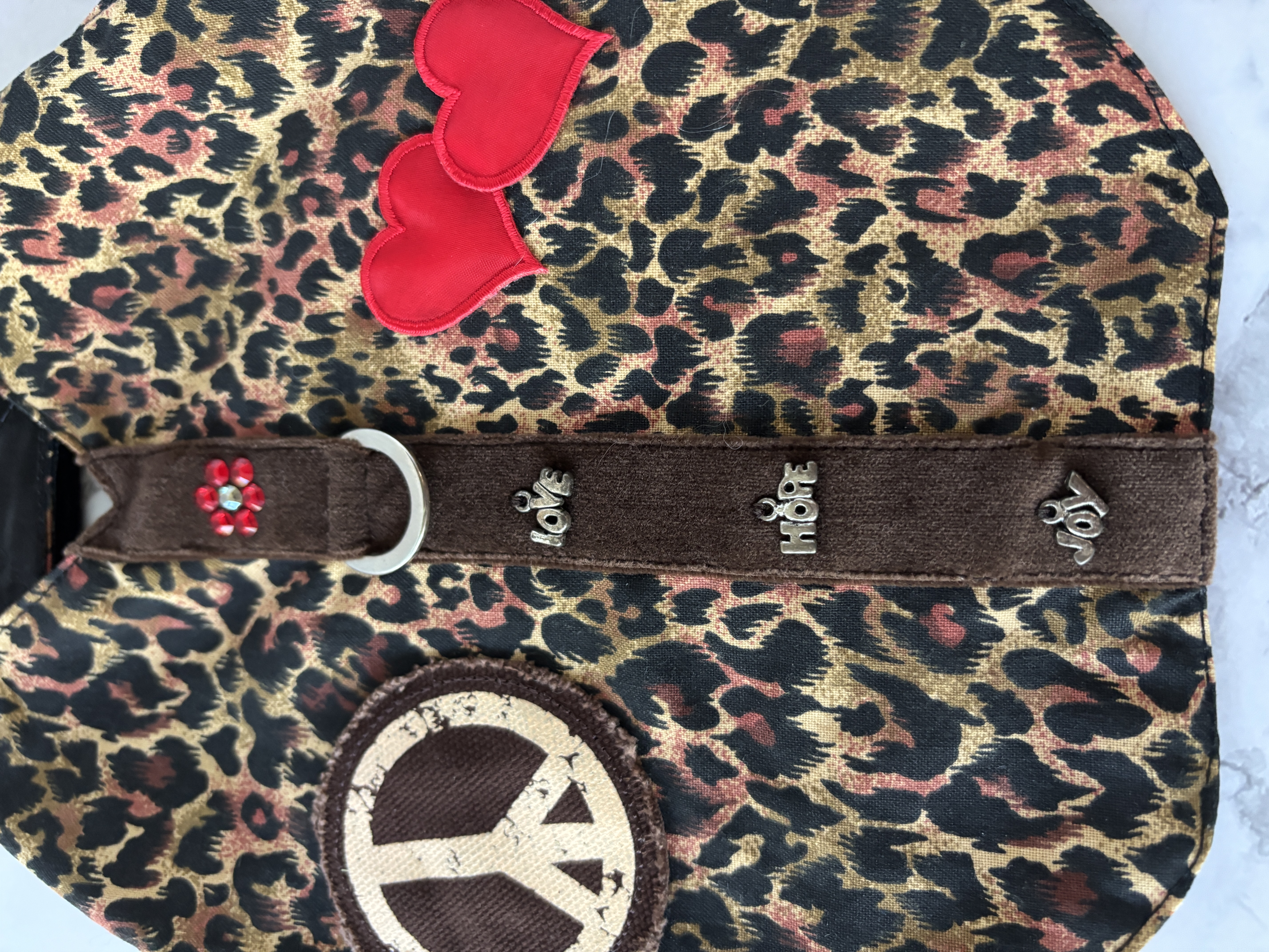 I made this using cotton fabric, satin, Austrian crystals, patches, pewter charms, a solid cast d-ring, Velcro, thread and stabilizers.