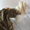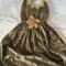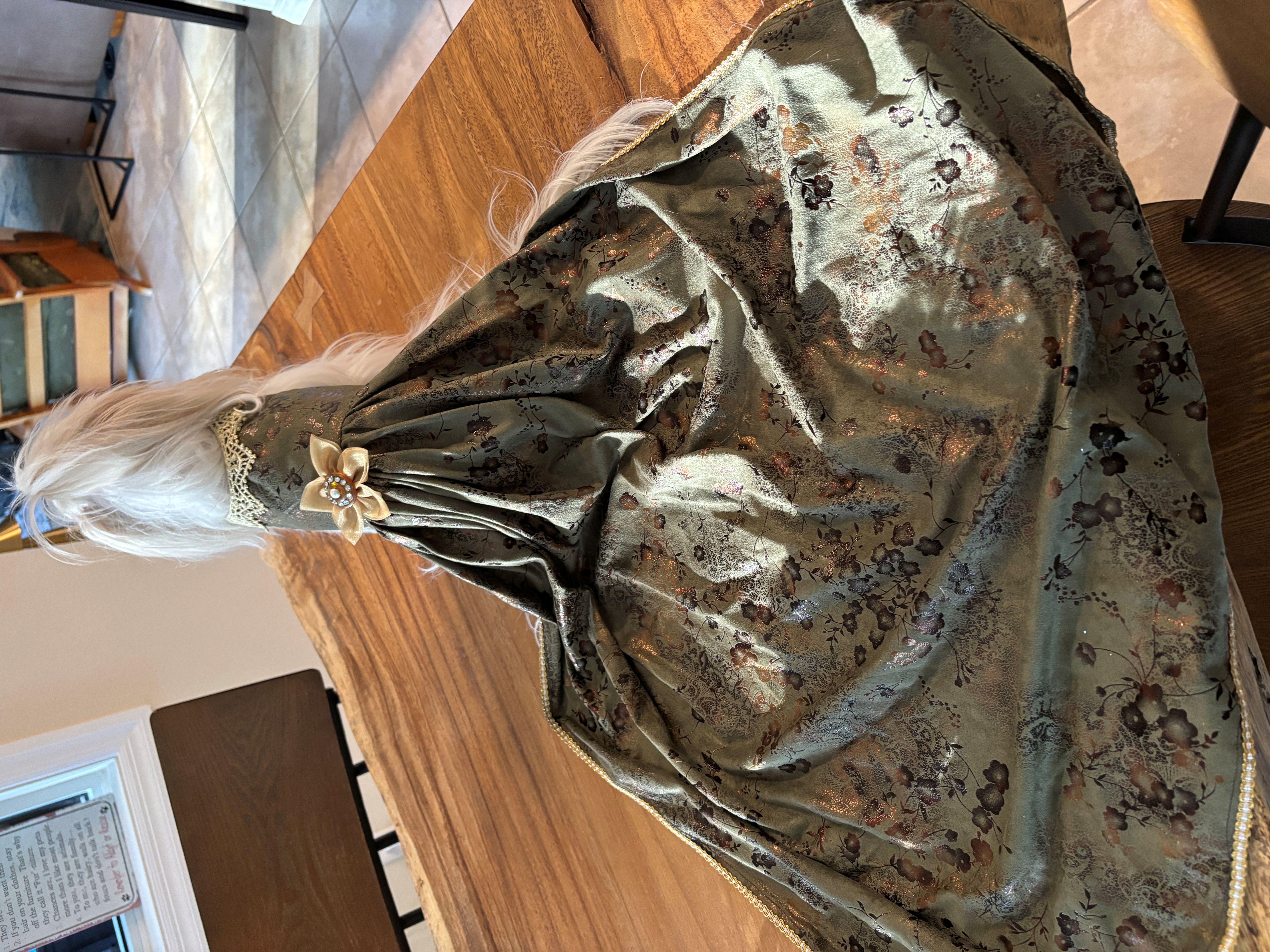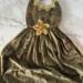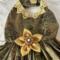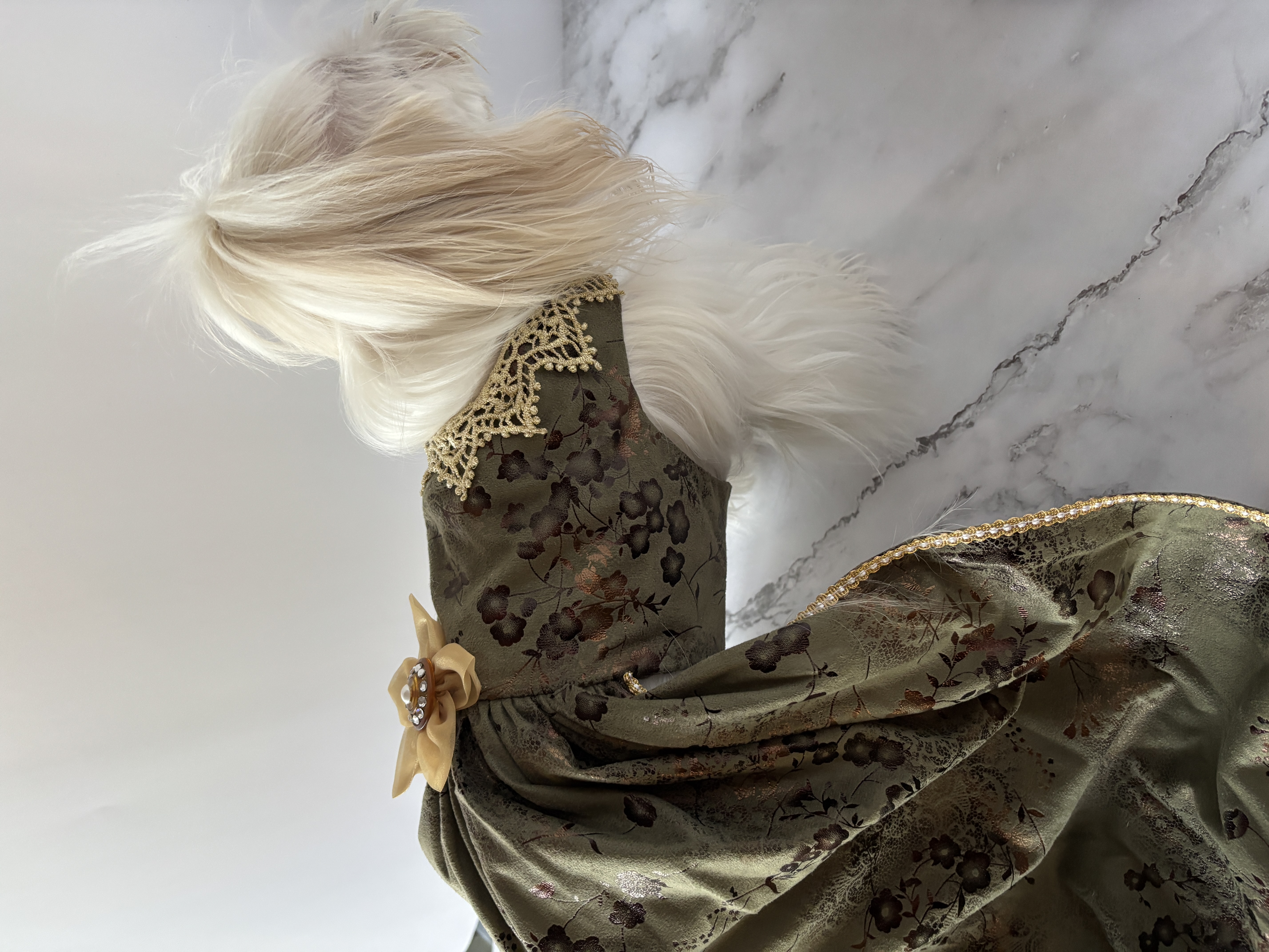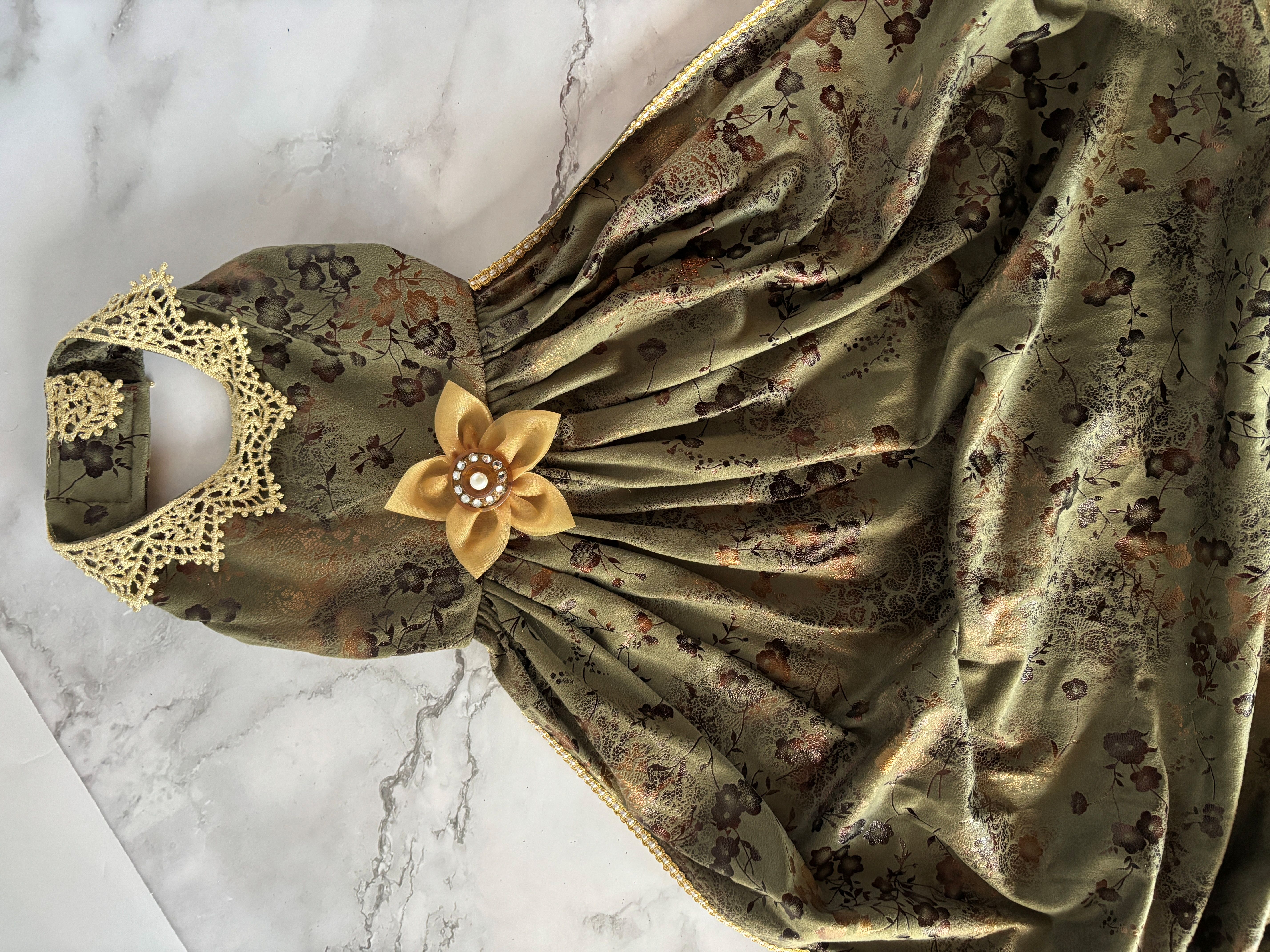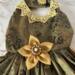 This dress was made for a huge fashion show in LA, and I made it so when worn the little lady would feel really regal. LOL The fabric is very soft and has a gold shimmer to it, with a shimmery lace collar, beautiful trim around the whole skirt, and a beautiful flower at the waist that is adorned with a pearl and pure Austrian crystals.