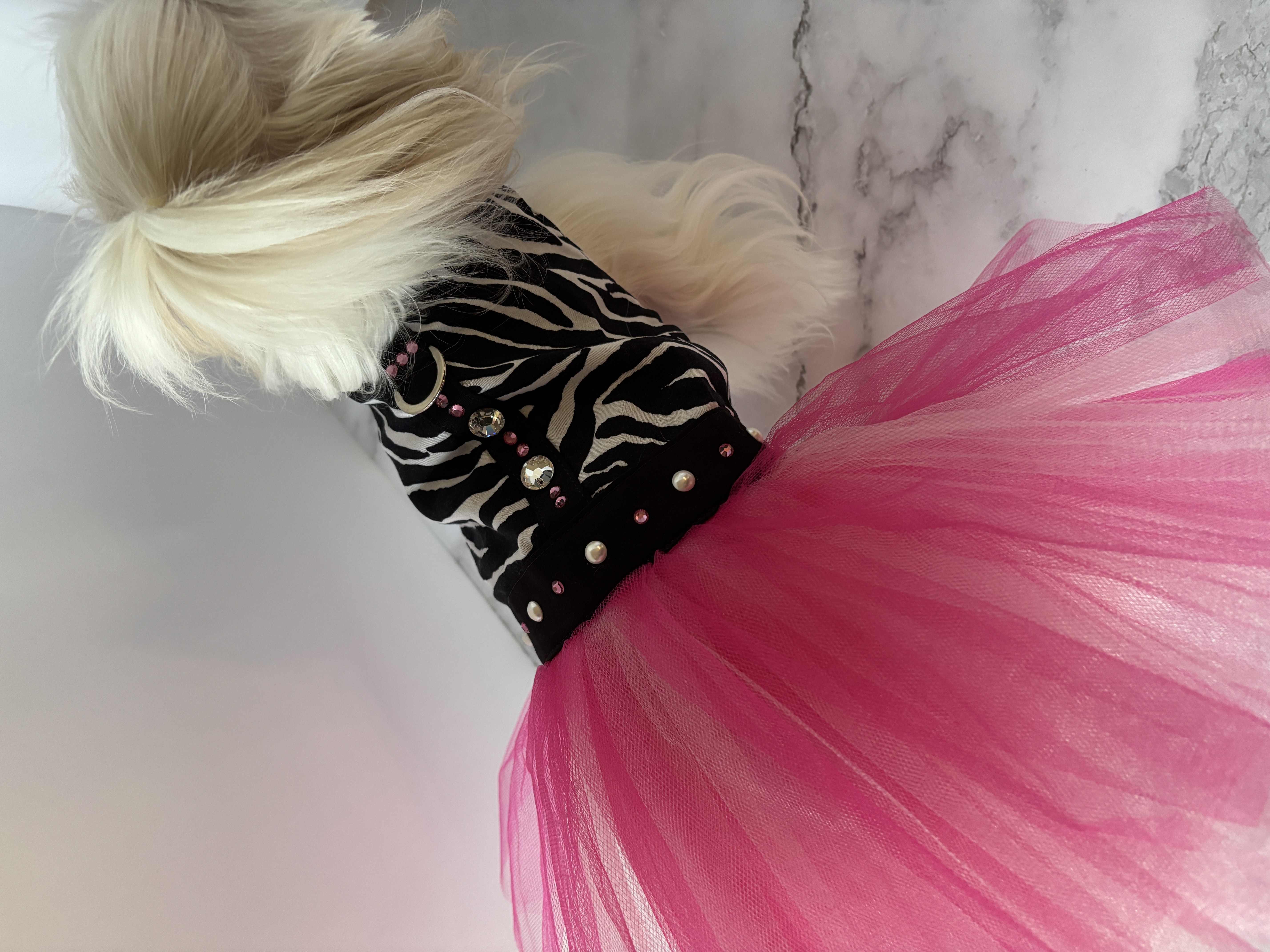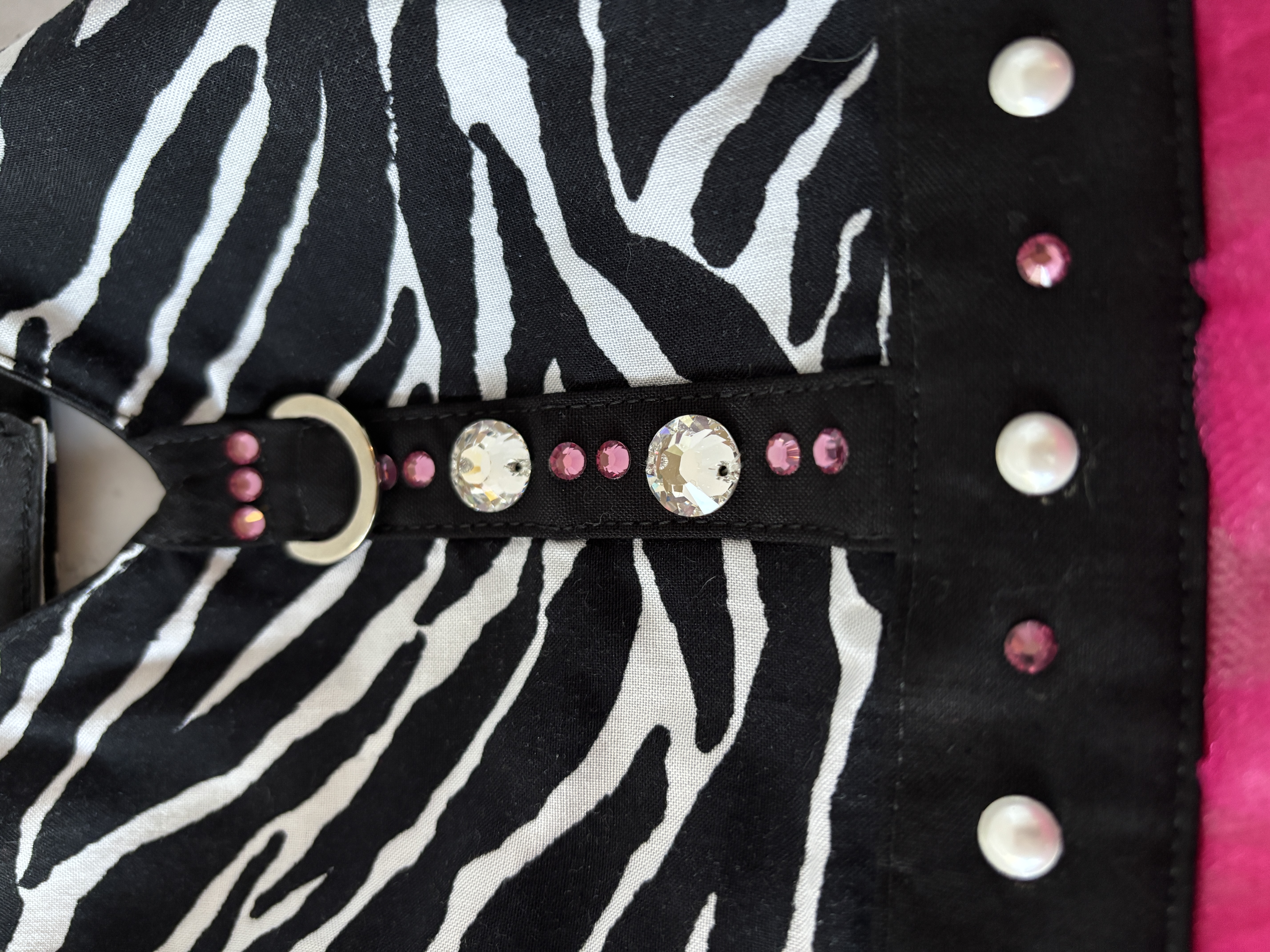 The harness is so fun and playful, and would be perfect to wear anywhere. It has a solid cast D-ring to use for a leash. I made this using pearls and pure Austrian Crystals (I can no longer use the name brand of the crystals because I am no longer a brand partner with them), and they are stunning and capture the light so beautifully.