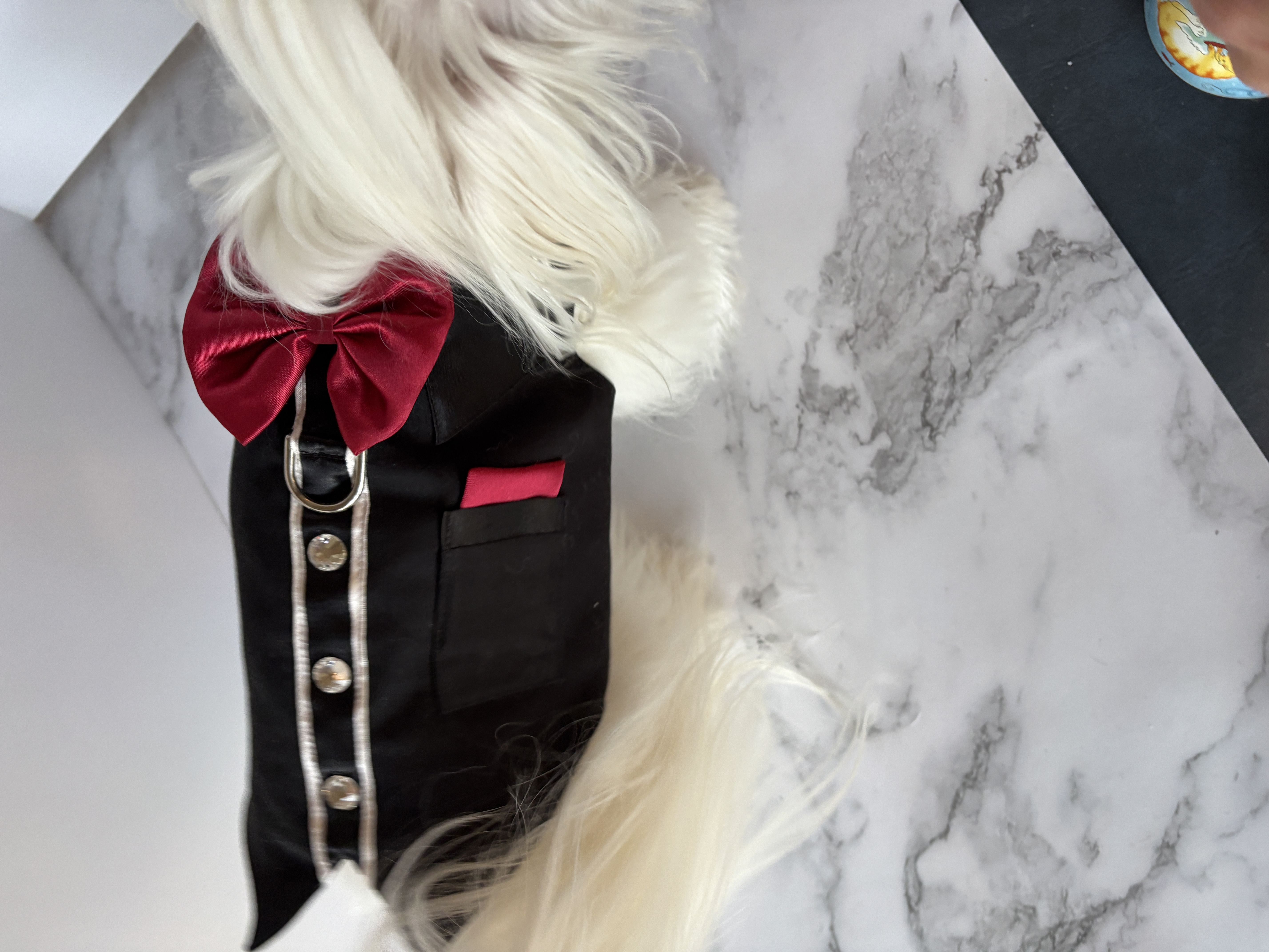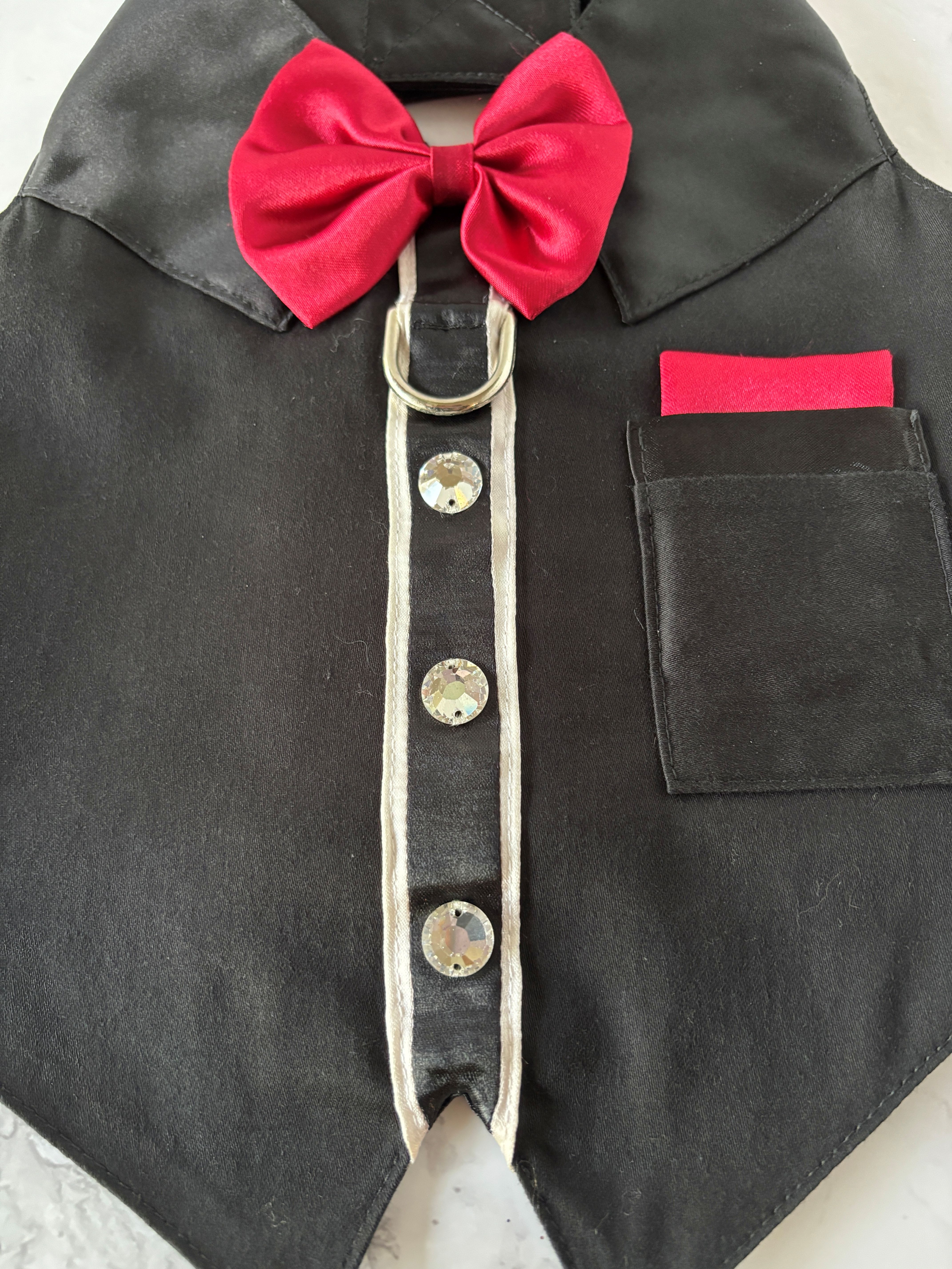 I made multiples of this harness for people's weddings, and the pups made the crowds ooh and ahh (almost more than some did when they saw the bride! LOL) The fabric, the gorgeous Austrian crystals including over-sized crystals as buttons, and the usable pocket! It is stunning! The harness has a solid cast D-ring to use for a leash, and is made this using pure Austrian Crystals (I can no longer use the name brand of the crystals because I am no longer a brand partner with them), and they are stunning and capture the light so beautifully.